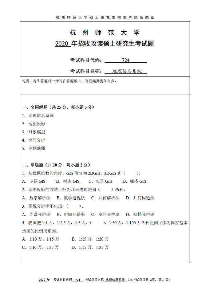 724地理信息系统(杭州师范大学2020年招收攻读硕士研究生考试题).pdf