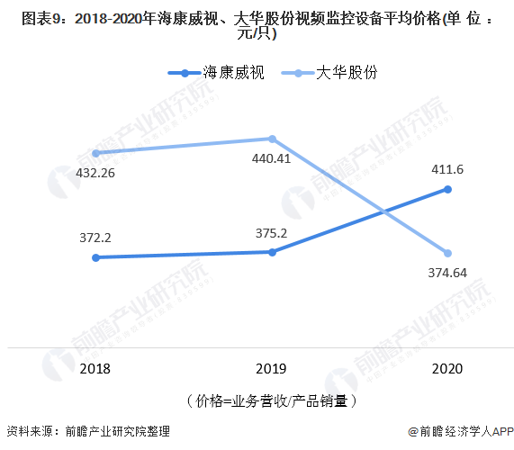 2018-2020年,在视频监控设备的价格方面,海康威视和大华股份走势差距较为明显,海康威视的设备平均价格整体呈上升趋势,大华股份的设备平均价格波动下降,2020年,海康威视的视频监控设备平均价格为411.6元/只,大华股份的视频监控设备平均价格为374.6元/只.