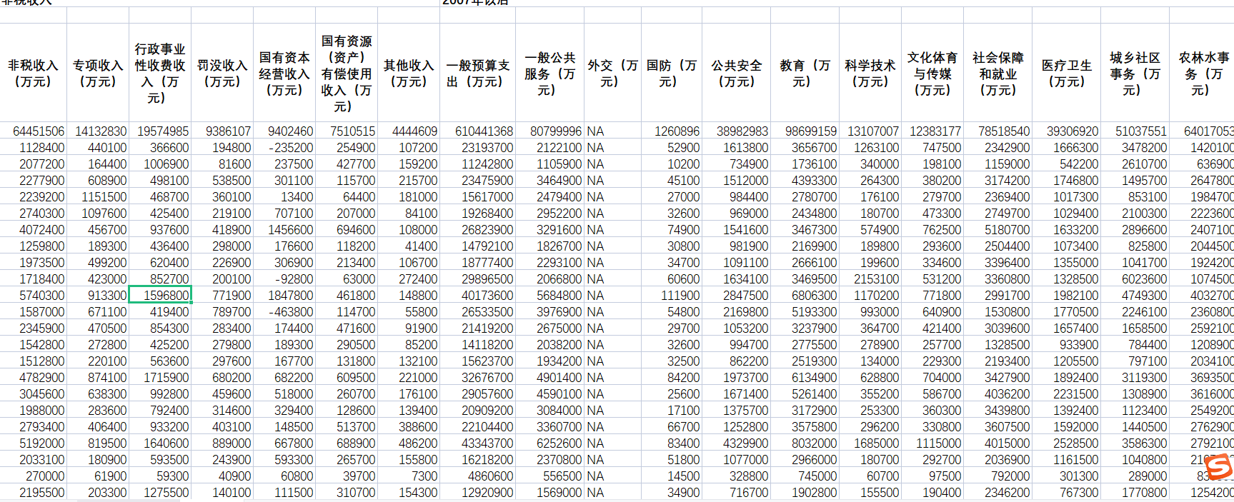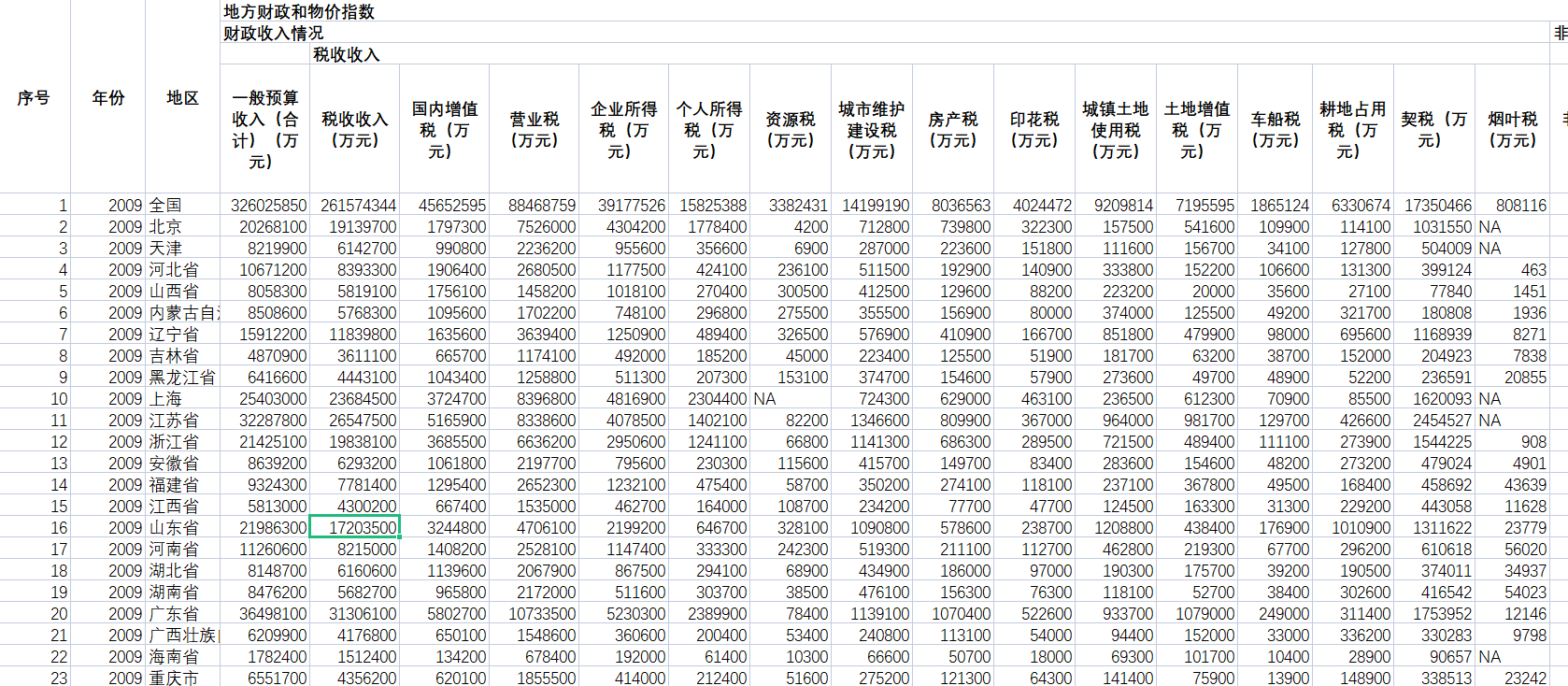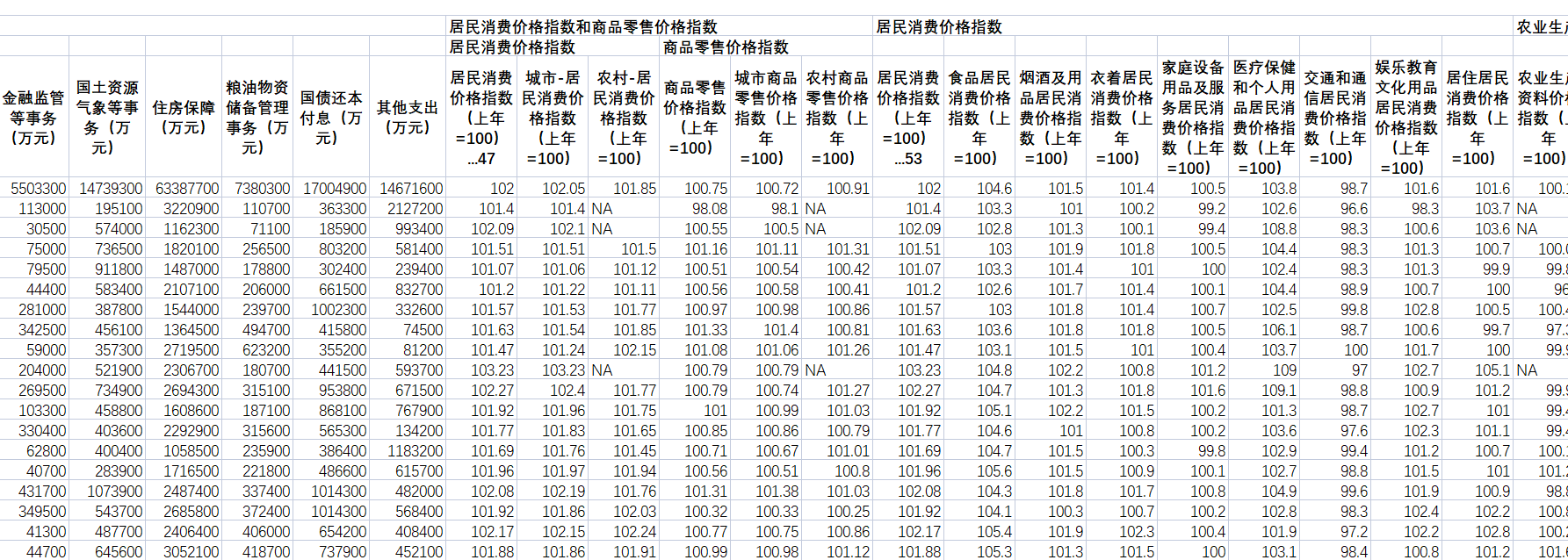 一般预算收入(合计)(万元)、税收收入(万元)、国内增值税(万元)、、营业税(万元)、企业所得税(万元)、个人所得税(万元)、资源税(万元)、城市维护建设税(万元)、房产税(万元)、印花税(万元)、城镇土地使用税(万元)、土地增值税(万元)、车船税(万元)、耕地占用税(万元)、契税(万元)、烟叶税(万元)、非税收入(万元)、专项收入(万元)、行政事业性收费收入(万元)、罚没收入(万元)、国有资本经营收入(万元)、国有资源(资产)有偿使用收入(万元)、其他收入(万元)、一般预算支出(万元)、一般公共服务(万元)、外交(万元)、国防(万元)、公共安全(万元)、教育(万元)、科学技术(万元)、文化体育与传媒(万元)、社会保障和就业(万元)、医疗卫生(万元)、城乡社区事务(万元)、农林水事务(万元)、交通运输(万元)、资源勘探电力信息等事务(万元)、商业服务业等事务(万元)、金融监管等事务(万元)、国土资源气象等事务(万元)、住房保障(万元)、粮油物资储备管理事务(万元)、国债还本付息(万元)、其他支出(万元)、居民消费价格指数(上年=100)...47、城市-居民消费价格指数(上年=100)、农村-居民消费价格指数(上年=100)、商品零售价格指数(上年=100)、城市商品零售价格指数(上年=100)、农村商品零售价格指数(上年=100)、居民消费价格指数(上年=100)...53、食品居民消费价格指数(上年=100)、烟酒及用品居民消费价格指数(上年=100)、衣着居民消费价格指数(上年=100)、家庭设备用品及服务居民消费价格指数(上年=100)、医疗保健和个人用品居民消费价格指数(上年=100)、交通和通信居民消费价格指数(上年=100)、娱乐教育文化用品居民消费价格指数(上年=100)、居住居民消费价格指数(上年=100)、农业生产资料价格指数(上年=100)、家用手工工具(小农具)价格指数(上年=100)、饲料价格指数(上年=100)、产品畜价格指数(上年=100)、半机械化农具价格指数(上年=100)、机械化农具价格指数(上年=100)、化学肥料价格指数(上年=100)、农药及农药械价格指数(上年=100)、农用机油价格指数(上年=100)、其他农业生产资料价格指数(上年=100)、农业生产服务价格指数(上年=100)、固定资产投资价格指数(上年=100)、建筑安装工程固定资产投资价格指数(上年=100)、设备工器具购置固定资产投资价格指数(上年=100)、其他费用固定资产投资价格指数(上年=100)