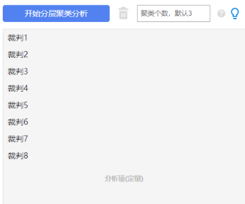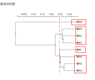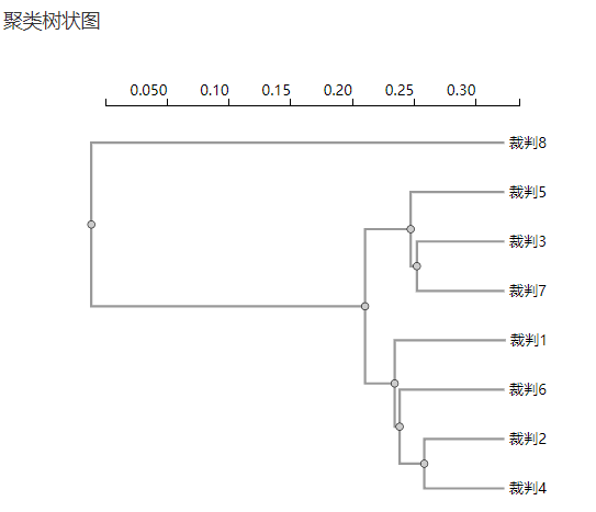 结合树状图进行分析,如果聚类为一个类别,此时其中一个类别仅对应1项,另外一个类别对应7项;如果聚类为四个类别,其中有一项无法很好的区分成一类;最终聚类为三类最为合适,第1个类别对应裁判8;第2个类别对应裁判5,3,7;第3个类别对应裁判1,6,2,4。