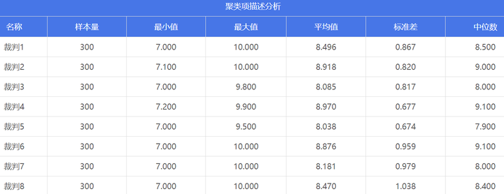 上表格展示总共8个分析项(即8个裁判数据)的基本情况,包括均值,最大或者最小值,中位数等,以便对于基础数据有个概括性了解。整体上看,8个裁判的打分基本平均在8分以上。