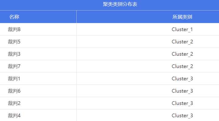 总共聚类为3个类别,以及具体分析项的对应关系情况。在上表格中展示出来,上表格可以看出:裁判8单独作为一类;裁判5,3,7这三个聚为一类;以及裁判1,6,2,4作为一类。
