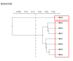 SPSSAU会首先输出聚类项的基本描述情况,接着输出每项的聚类类别归属情况;并且输出树状图,如下所述: