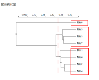 树状图的解读上,建议单独画一条垂直线,然后对应查看分成几个类别,以及每个类别与分析项的对应关系。比如下图中,红色垂直线最终会拆分成3个类别:第1个类别对应裁判8;第2个类别对应裁判5,3,7;第3个类别对应裁判1,6,2,4。