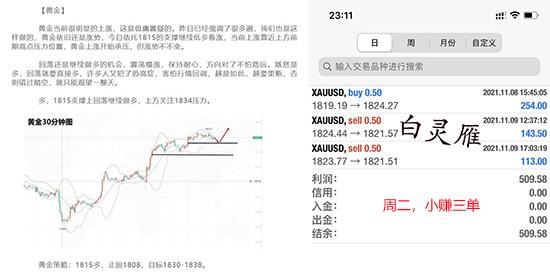 第三单:1823.77进场空,1821.51出局,获利113美元。