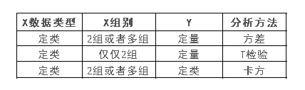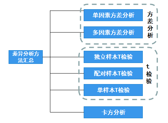 差异研究的目的在于比较两组数据或多组数据之间的差异,通常包括以下几类分析方法,分别是方差分析、T检验和卡方检验。
