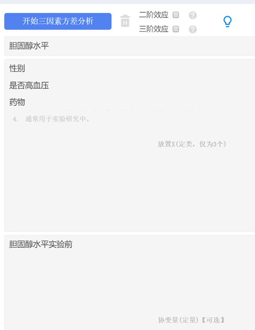 多因素方差分析通常用于类实验式问卷研究。 比如研究者测试某新药对于胆固醇水平是否有疗效;研究者共招募72名被试,男女分别为36名,以及男女分别再细分使用新药和普通药物;同时高血压患者对于新药可能有干扰,因而研究者将被试是否患高血压也纳入考虑范畴中。因而最终,X共分为三个,分别是药物(旧药和新药)、性别,是否患高血压;Y为胆固醇水平。因而需要进行三因素方差分析即多因素方差分析。