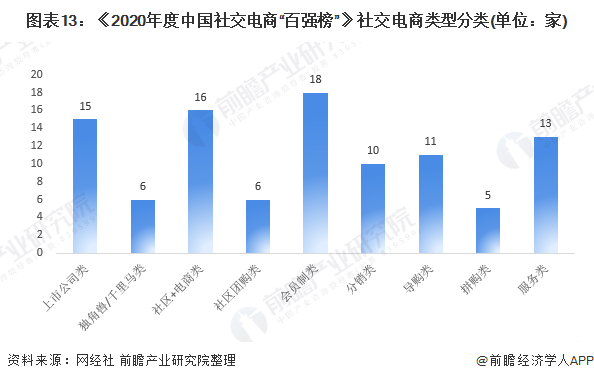 具体来看,在百强榜中,上市公司类平台有15家,独角兽/千里马类有6家,社区+电商类16家,社区团购类6家,会员制类18家,分销类10家,导购类11家,拼购类5家,服务类13家。