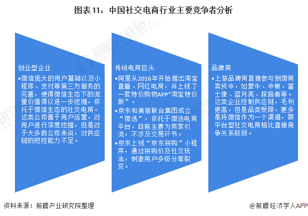 当前,我国社交电商行业主要存在三种竞争者,一是以微信为代表的创业型企业,二是以淘宝、京东为代表的传统电商巨头,三是品牌商。