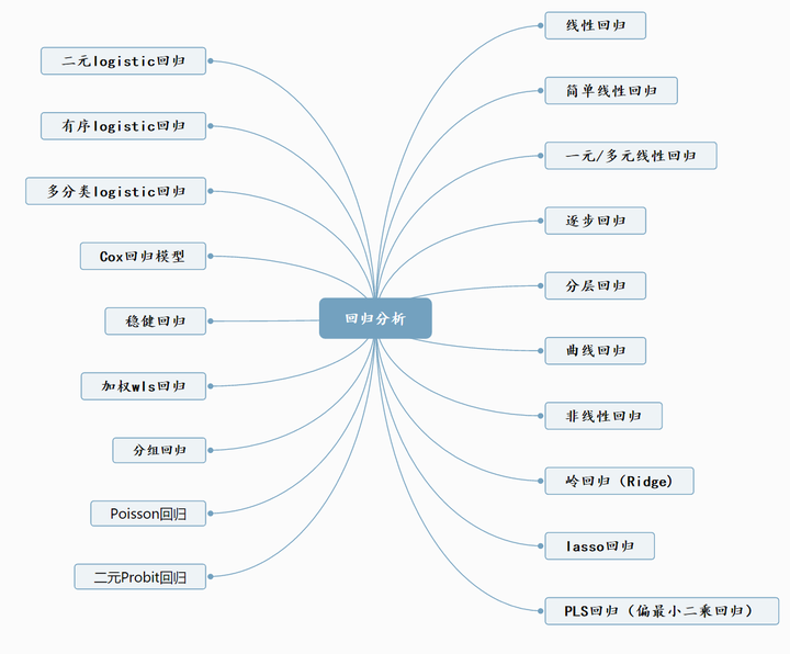 其实说简单点就是研究X对于Y的影响关系,这就是回归分析。但是,这并不够呢,看下图,总共19种回归(其实还有不单独列出),这如何区分,到底应该使用哪一种回归呢,这19种回归分析有啥区别呢。为什么会这如此多的回归分析呢?