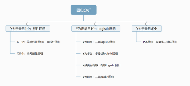首先将回归分析中的Y(因变量)进行数据类型区分,如果是定量且1个(比如身高),通常我们会使用线性回归,如果Y为定类且1个(比如是否愿意购买苹果手机),此时叫logistic回归,如果Y为定量且多个,此时应该使用PLS回归(即偏最小二乘回归)