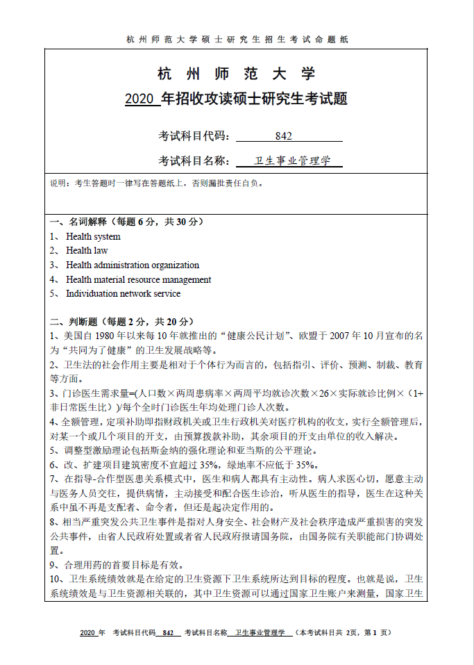 842卫生事业管理学(杭州师范大学2020年招收攻读硕士研究生考试题).pdf