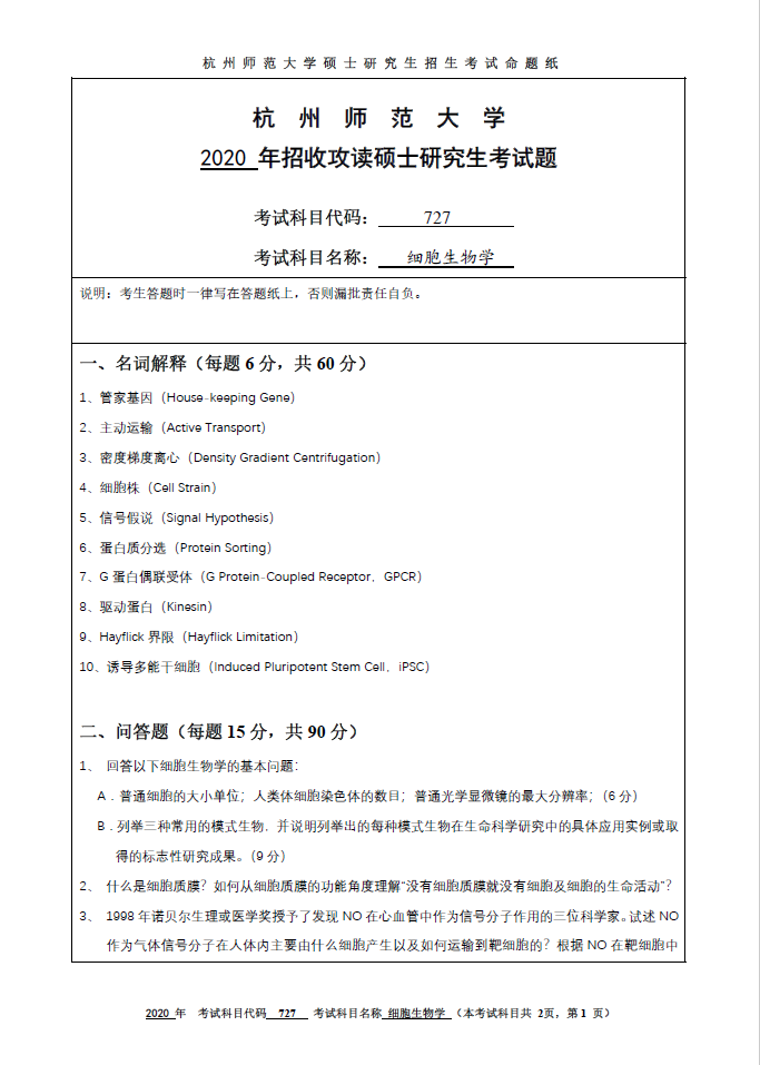 727细胞生物学(杭州师范大学2020年招收攻读硕士研究生考试题).pdf