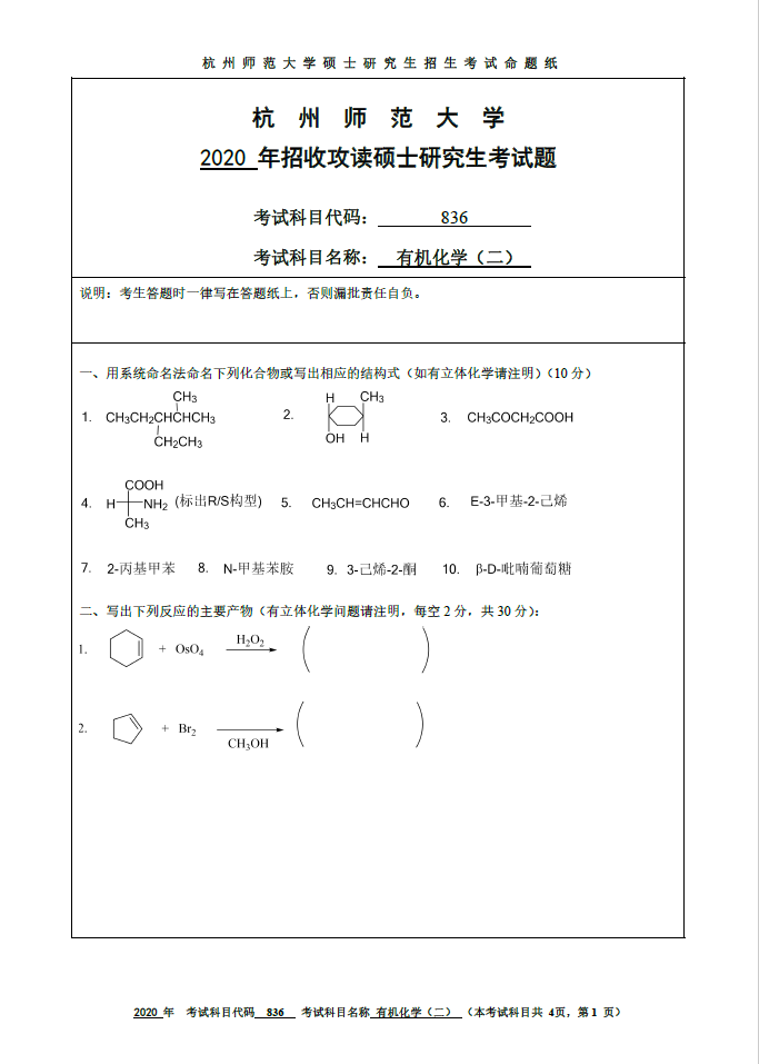 836有机化学【二】(杭州师范大学2020年招收攻读硕士研究生考试题).pdf