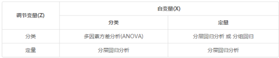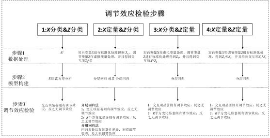 - 调节作用通常是使用分层回归进行研究,如果X和Z均为分类数据,则使用多因素方差分析(通常是双因素方差分析)进行研究。针对上图,需要说明如下: