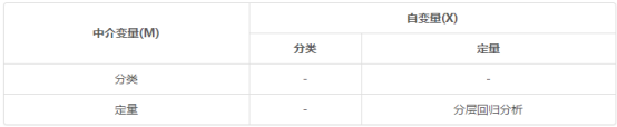 中介作用在进行具体研究时需要对应使用研究方法(分层回归)去实现;中介作用分析时,Y一定是定量数据。X也是定量数据,中介变量M也是定量数据。