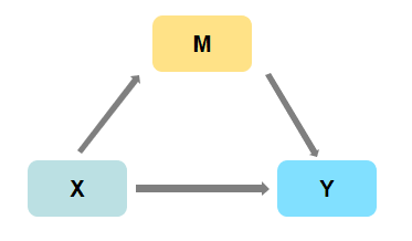 中介作用是研究X对Y的影响时,是否会先通过中介变量M,再去影响Y;即是否有X->M->Y这样的关系,如果存在此种关系,则说明具有中介效应。比如工作满意度(X)会影响到创新氛围(M),再影响最终工作绩效(Y),此时创新氛围就成为了这一因果链当中的中介变量。