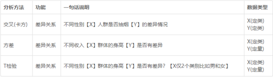 - 其实核心的区别在于:数据类型不一样。如果是定类和定类,此时应该使用卡方分析;如果是定类和定量,此时应该使用方差或者T检验。