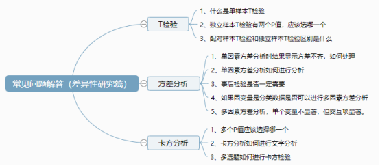 针对不同的数据类型,研究者需要使用不同的方法和统计量来实现具体的差异性研究问题。差异研究通常包括以下几类分析方法,分别是T检验、方差分析和卡方检验。本文就针对各种数据类型相应检验方法及其常见问题进行解答。