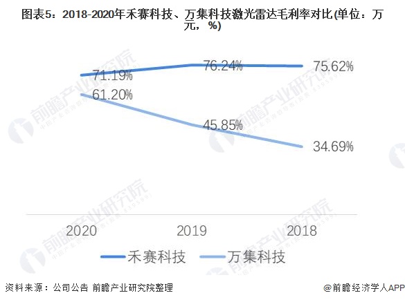 从激光雷达业务的毛利率来看,2018-2020年,禾赛科技的激光雷达业务毛利率均高于万集科技;从毛利率变化趋势来看,禾赛科技的激光雷达业务毛利率总体稳定,而万集科技的毛利率不断提升。2020年,两家龙头激光雷达企业的激光雷达业务毛利率差距较2018年大幅缩小。禾赛科技毛利率为71.19%,万集科技毛利率为61.20%,禾赛科技高出约10%。
