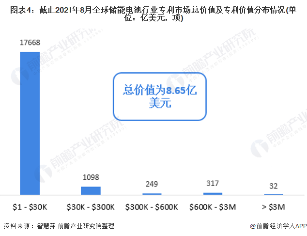 目前,全球储能电池行业专利总价值为8.65亿美元。其中,3万美元以下的储能电池专利申请数量最多,为1.77万项;其次是3万-30万美元的储能电池专利,合计专利申请量为1098项。3百万美元的储能电池专利申请数量最少,为32项。