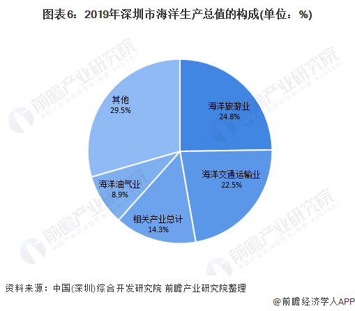 从生产总值的构成来看,2019年,深圳主要海洋产业增加值占海洋生产总值的70%,其中,海洋旅游业和海洋交通运输业占比较大,均在22%以上。