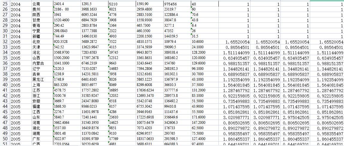 2004年的GTFP均为1,MI指数即绿色全要素生产率的变化率,不过绿色全要素生产率我也折算出来了。
