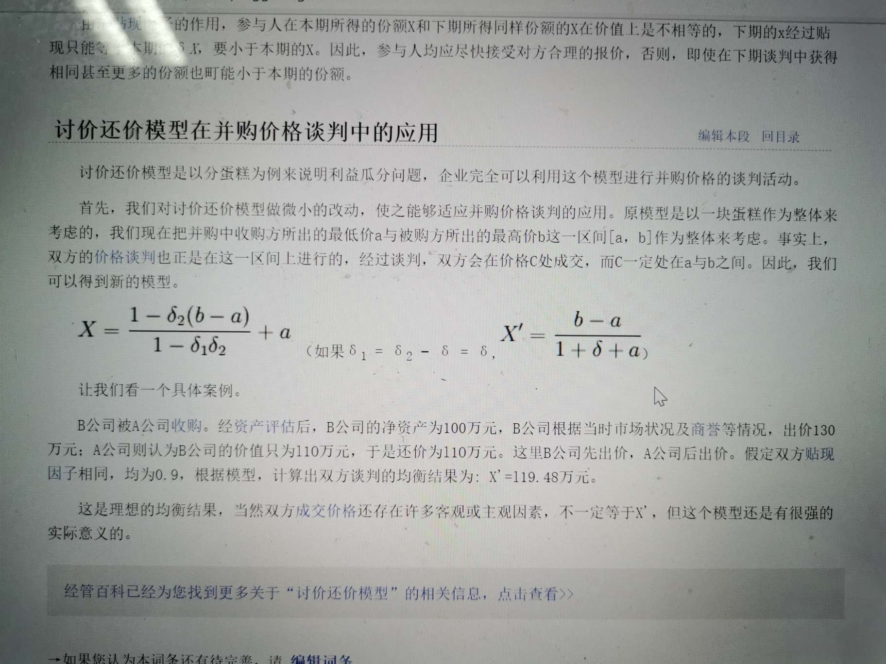 讨价还价模型在并购价格谈判中的应用怎么求啊