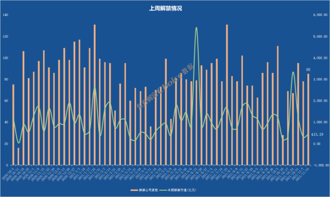 上周,解禁总规模为433.298亿元,相比前周增加了109.81亿,解禁家数85家。