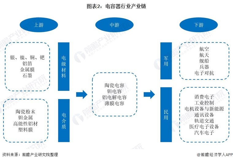 电容器产业链上游为电极材料和电解质材料行业,下游行业主要应用于军用和民用领域,军用领域包括航空、航天、舰船、兵器、电子对抗等,民用领域包括消费电子、工业控制、电力设备及新能源、通讯设备、轨道交通、医疗电子设备及汽车电子等。