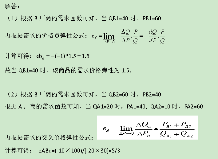 (2)如果B厂商降价后,B厂商的需求量增加为QB2=60,同时使竞争对手A厂商的销售量减少为 QA2=10,那么A厂商对B厂商的需求交叉价格弹性系数为多少?