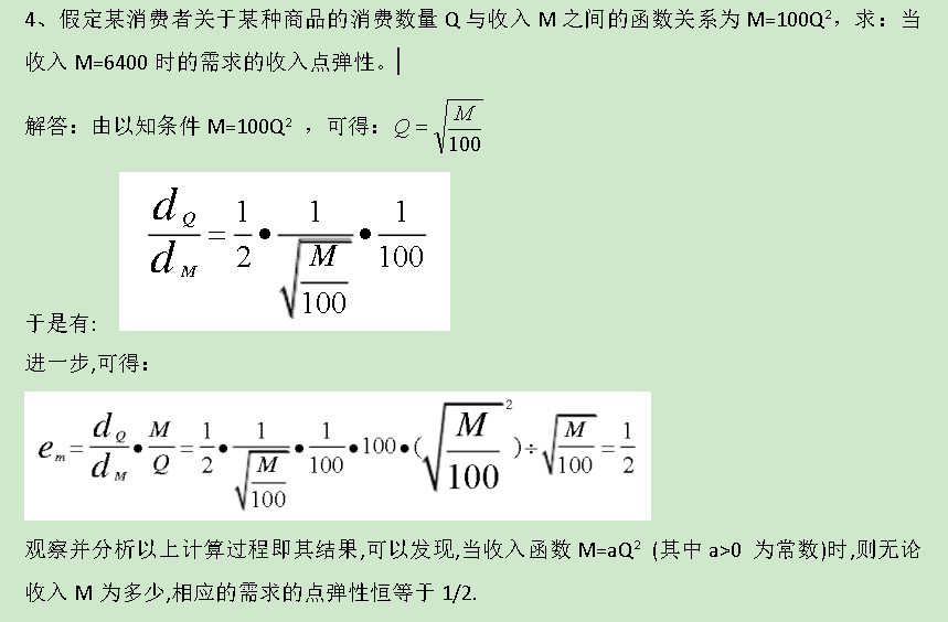 4、假定某消费者关于某种商品的消费数量Q与收入M之间的函数关系为M=100Q2,求:当收入M=6400时的需求的收入点弹性。