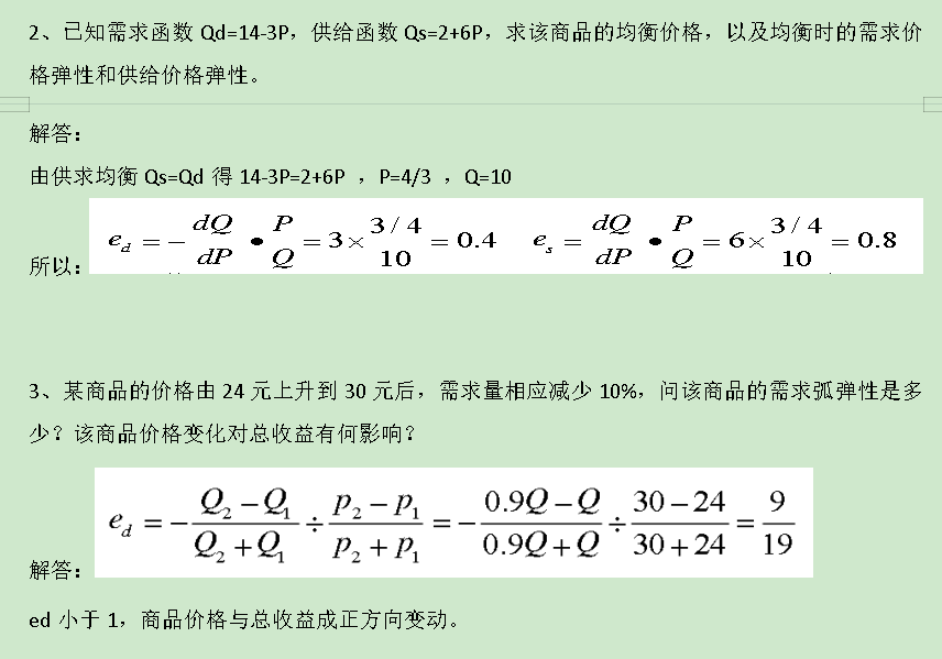 2、已知需求函数Qd=14-3P,供给函数Qs=2+6P,求该商品的均衡价格,以及均衡时的需求价格弹性和供给价格弹性。
