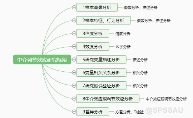 调节/中介作用研究框架,类似于第一类即“影响关系研究”。但此类框架更常见于学术研究,因而可能会多出中介作用,或者调节作用这两部分,基余部分与“影响关系研究”基本类似。