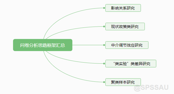 本文就从问卷设计思路出发,具体细分不同类型的问卷或者话题,为大家讲解五种常见类型问卷的数据分析思路,分别是影响关系类研究,现状政策类研究,调节/中介类研究,“类实验”类差异研究以及聚类样本类研究。