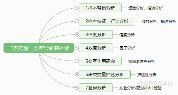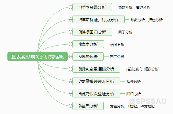 这类分析思路针对于使用实验式方法和问卷形式进行的关系研究,通常问卷设计会包括不同情景设置。比如百货商店音乐刺激对于消费意愿的影响研究,通常问卷里面会有不同情景,比如有背景音乐或者无背景音乐,也或者有不同类型背景音乐等。此类分析思路框架强调不同场景或者不同实验情况下的差异比较,通常情况下会有较多的量表题项。市场营销、心理学、媒体等相关专业会使用此分析框架进行各类研究。