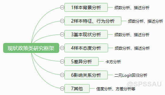 现状政策类研究是非常普遍的,分析思路倾重于现状及基本态度,和差异对比研究,了解群体的基本认知,态度,观点意见或者行为等。 通常情况下现状政策类研究更多是非量表题项, 此类研究框架的核心在于“分组”。 第一件事情为“分组”;比如有30个题,那此此30个题项可以分别归纳为几个方面呢?比如基本背景,认知,态度,行为,原因等五个方面。第二件事情是将“分组”分别作为一个部分进行分析。第三件事情是分组题项与分组题项之间进行交叉。社会学类、媒体等相关专业会使用此分析框架进行相关研究,以及企业问卷研究较适用于此类分析思路框架。