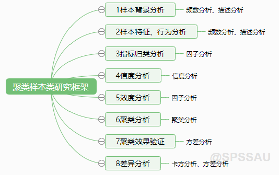 聚类样本研究的分析思路倾向于样本“分类”,即样本人群应该分成几个类别;分了类别之后,通常肯定是需要对比不同类别人群的差异性,比如不同类别群体在态度,行为上的差异性等。问卷设计时应该注意到量表题项可能用于聚类样本时使用,以及此类问卷也会有较多非量表题项,用于了解样本的特征情况。社会学类、市场营销类相关专业常使用此分析框架进行研究,此分析思路框架更适用于有一定统计基础的读者。