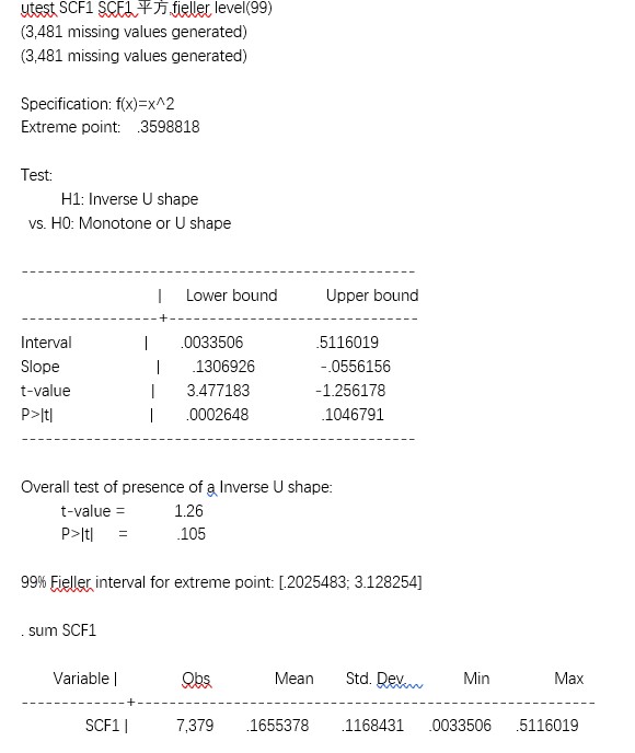 请教黄老师,我做了两个utest检验,第一个是此题图片,|sa指数|与SCF的倒u型,另一个是Moti(我自己合成的一个“对银行激励程度”的指标)与SCF的u型检验,这个特别显著。我的目的是证明SCF通过M0ti降低|sa指数|,很巧的一个点是,这两个utest检验得到的峰值近乎完全一样,所以老师,如果我有现实逻辑(供应链金融通过提高Moti来降低融资约束情况,Moti和|sa指数|是此涨彼消)作为支撑,前面这个utest检验结果可以适当放松吗?