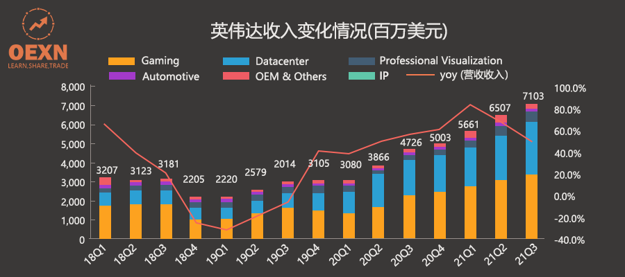 OEXNA报道:周三盘后,全球最大芯片制造商英伟达公布了第三季度业绩,据数据显示,该公司营收较同期上涨50%达71亿,净利润也较同期增长了84%,达24.6亿,在如此亮眼的数据加持下,英伟达市值一度跃升7315亿美元,甩掉另一芯片巨头英特尔约5272亿美元。