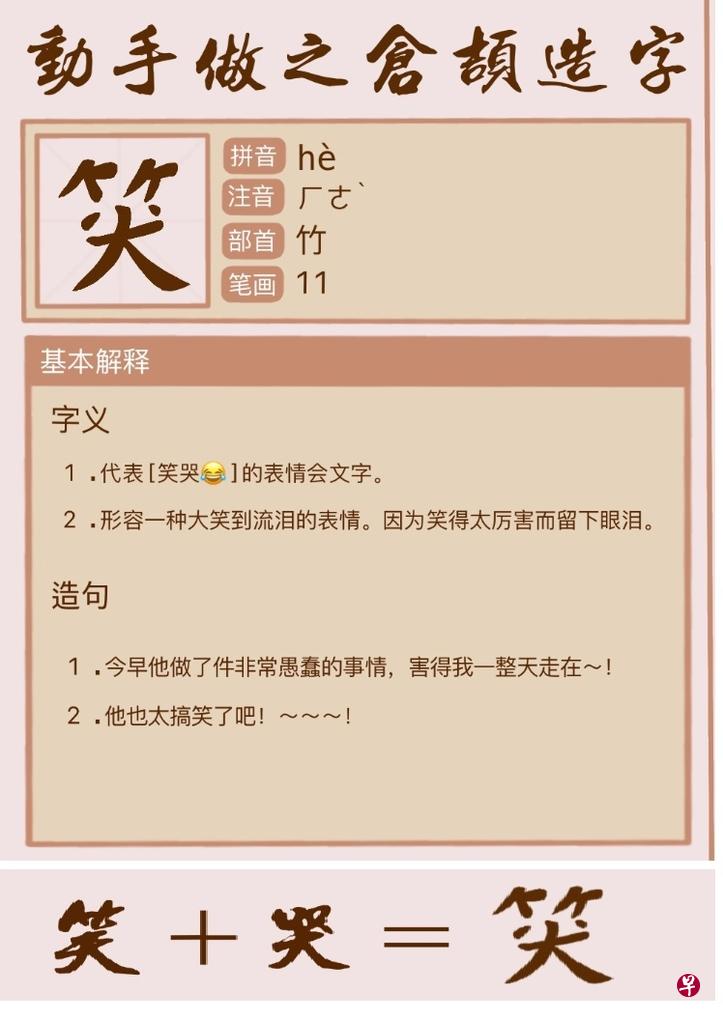 我教文图学课的作业之一,是让同学们做当代仓颉,造新的汉字,包括字形、发音和例句。你看,这位同学把笑中带泪的绘文字制成“笑加上哭”的新字,是不是很有创意呢?