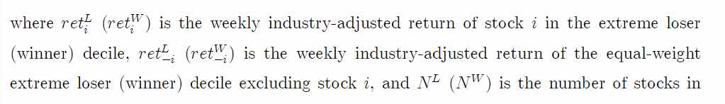 Industry-adjusted return of the equal-weight extreme loser (winner) decile excluding stock i