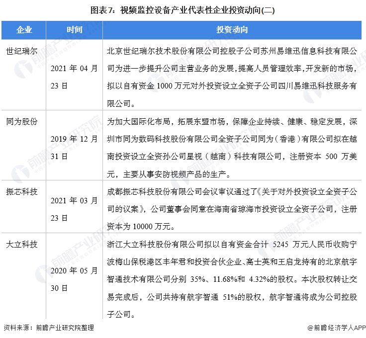 2020年以来,视频监控设备产业代表性企业的投资动向主要包括收购公司拓展业务、通过对子公司增资的方式投资视频监控设备生产基地项目。视频监控设备产业代表性企业最新投资动向如下: