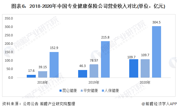 从健康险业务的经营情况来看,2018-2020年,人保健康业务收入均领先于其他两家专业健康险企,2020年,人保健康业务实现收入304.5亿元,而昆仑健康及平安健康业务收入均为109.7亿元。
