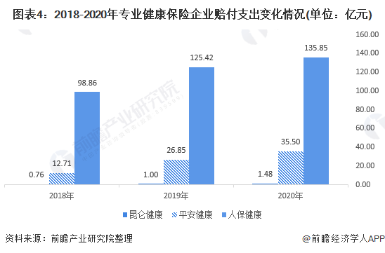 2018-2020年,专业健康保险企业健康赔付呈现出逐年递增的趋势,其中以人保健康赔付支出的最高2020年赔付支出超过135亿元,平安健康与昆仑健康赔付支出从赔付支出规模来看远低于人保健康。