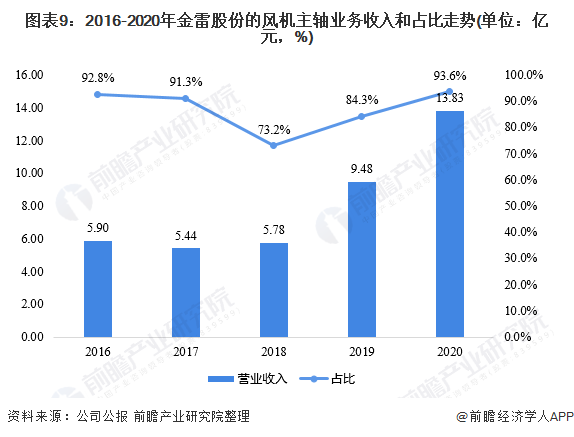 近年来,金雷股份的风机主轴收入呈现倒V态势;从2016年的5.9亿元上升至2020年的13.83亿元。而业务占总营收的比重也一直维持在80-95%之间,可以看出风电主轴是金雷股份的主要收入来源。