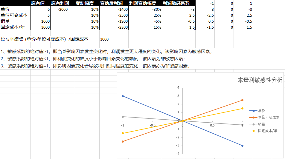 利用excel进行本量利敏感性分析,输入单价,单位可变成本,销售量,固定成本,excel自动计算敏感系数及盈亏平衡点,并根据结果绘制本量利敏感性分析图,如下图所示