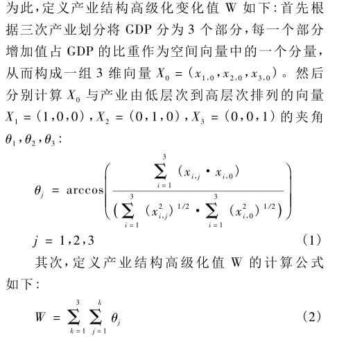 产业结构高级化:付凌晖(2010)设立的“产业结构高级化指数”通过研究空间解析几何三维向量夹角的思路,来表征产业结构提升程度,该方法深入细化并避免了简单粗糙的主观赋值,逐渐成为国内学界的主要研究方法,也称“空间向量夹角法”。随着博士学者、国家统计局高级统计师、国家统计局新晋新闻发言人付凌晖先生的知名度扩大,该方法逐渐成为衡量产业结构的主要指标测算方法,也是整个产业经济学重要的被解释变量。