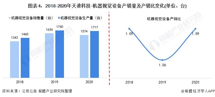 2018-2020年间,天准科技的机器视觉设备年产量由1465台增加至1717台,年销量由1343台上升至1574台,产销比始终在1以上,天准科技机器视觉设备供应充足。