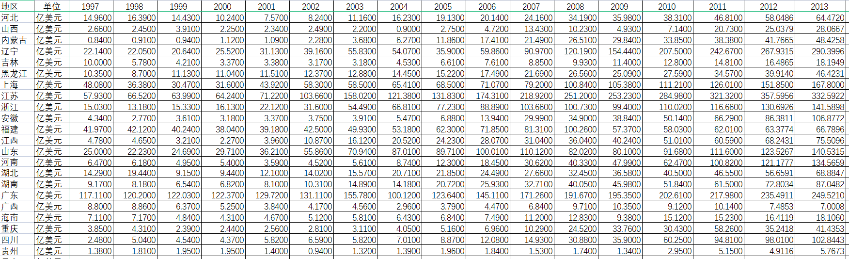 | 辽宁 | 亿美元 | 22.1400 | 22.0500 | 20.6400 | 25.5200 | 31.1300 | 39.1600 |